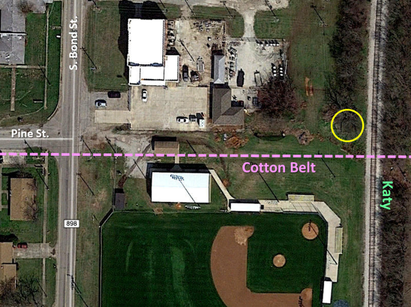 the foundation for the tower (yellow circle) and the former Cotton Belt