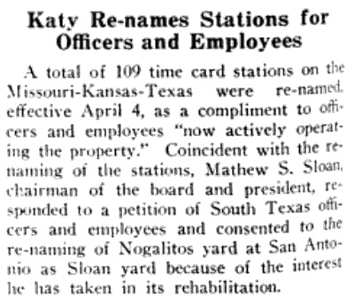 were removed. Far Left: The May 1, 1943 edition of Railway Age reported that the Katy was renaming various facilities for officers and employees, most notably changing the name of Nogalitos Yard to Sloan Yard. Left: The Sloan Yard land remained unoccupied for 25 years. In 2015, the KIPP Aspire Academy charter school was built on much of it. (Google Earth, October 2012) |