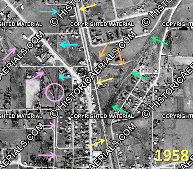 south of the switch.) The WBT&S main line (pink arrows) came north along