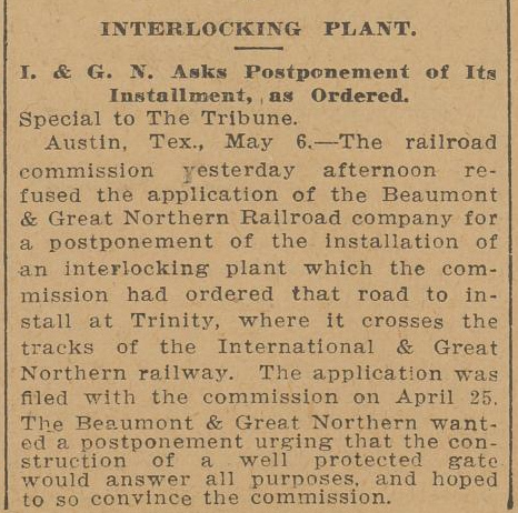 111? Below: An employee timetable (ETT) of the Missouri Pacific (MP) Railroad, Palestine Division dated October 30, 1932 (courtesy Missouri Pacific Historical Society) lists the community of Red Branch at milepost 55.8 on the I-GN rail line (pink arrows.) [Note that the I&GN had become the "I-GN" in 1922 and had been acquired by MP in 1925.] The interlocking for the RCLC tram is identified at milepost 63.0, 7.2 miles south of Red Branch. Red Branch Rd. still crosses the former I-GN rail line at grade, and aerial imagery from 1955 shows a small settlement adjacent to the crossing. Assuming this crossing represents MP's 1932 location for Red Branch, then measuring 7.2 miles south pinpoints the grade crossing (yellow circle) of the road highlighted by Google Maps. If this was indeed a tram crossing in the 1920s, then it is very likely the site of Tower 111. ![]() Can the opposite direction be measured? MP's ETT lists "Trinity" as the next location south of Tower 111 at milepost 64.8, a distance of 1.8 miles. "Trinity" was presumably the town's passenger depot but it could have been a freight depot or a yard office (or nothing at all, simply the closest tenth of a milepost to downtown.) The distance from the road crossing (yellow circle) to the site of the I-GN passenger depot is about 1.66 miles. This is a bit shy of 1.8 miles, but t he uncertainty of