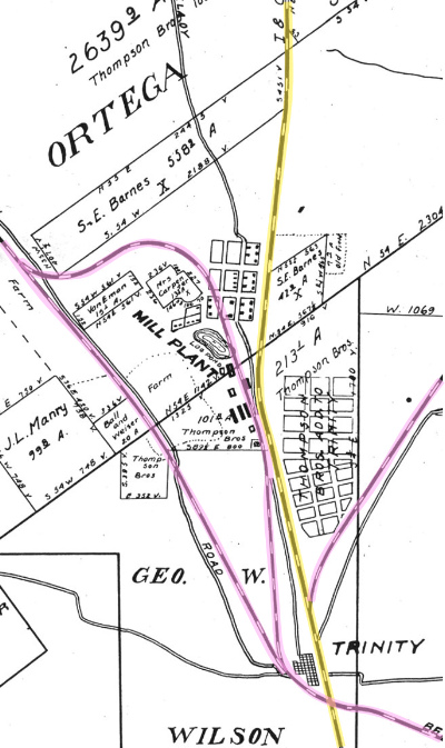 the WBT&S (B&GN) right-of-way (pink arrows and dashes) north of the mill. The route