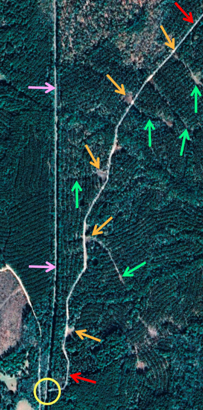 clearings (orange arrows) and cuts into the forest (green arrows) are