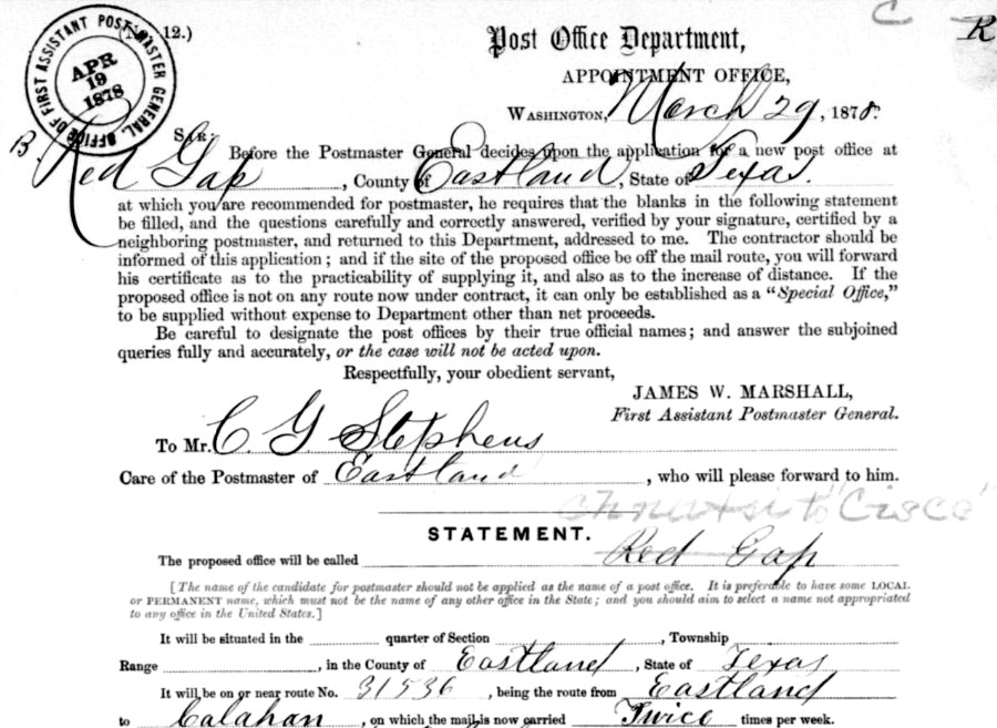 Betts survey". Thus, the new town of Eastland, named for the county, was