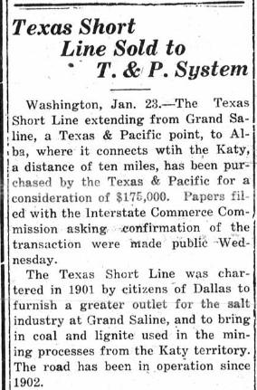 Daily Times, January 24, 1929 In early 1929, the T&P purchased the TSL but continued to operate it as a separate subsidiary. It seems highly likely that the purchase was a defensive move related to efforts that occurred throughout the 1920s to consolidate railroads into more efficient "systems." In the Transportation Act of 1920, Congress directed the Interstate Commerce Commission (ICC) to promote and plan consolidation of U.S. railroads into a limited number of "systems". The ICC responded by hiring economist William Z. Ripley to develop a plan. The so-called "Ripley Plan" announced several such systems, but there was push-back by the railroads which did not necessarily agree with the allocations made by Ripley. By 1926, Leonor F. Loree, a long time rail executive and head of the Delaware & Hudson Railroad, had gained control of the Katy, the St. Louis Southwestern ("Cotton Belt") and the Kansas City Southern (KCS), all of which operated throughout the southwest, each having a significant presence in east Texas. Loree proposed a Southwest System that would consolidate the Katy, KCS and Cotton Belt into one major railroad system operating in the southwest. Right: Grand Saline Sun, January 31, 1929 Meeks appeared before the ICC to testify against the Loree plan, asking that the TSL either be included within it or granted better division rates for traffic exchanged at Alba. The American Short Line Association was lobbying the ICC to require major system consolidations to account for the interests of the short line railroads. The T&P's purchase was simply to ensure that no other major railroad system gained a foothold at Grand Saline by acquiring the TSL. |