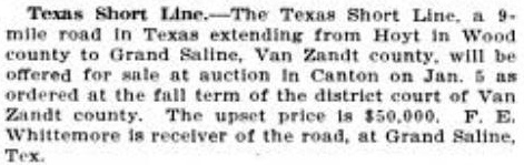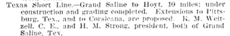 Quitman Democrat Before the end of January, the receivership was formally dismissed at Canton and one of the participants at the county courthouse was "J. W. Smart, cashier of the First State Bank of Quitman". It seems likely that a major portion of the new money that Meeks had rounded up to save the TSL came from the town of Quitman, county seat of Wood County. Alba and Mineola were both in Wood County and both had rail service, but Quitman did not. Quitman was only ten miles due east of Hoyt, so the idea of extending the TSL to Quitman was plausible, and a survey was apparently well underway. Right: Sulphur Springs Gazette, February 19, 1909 The TSL made no secret of their intent to build beyond Alba, but they were less forthcoming with a precise plan. In response to an inquiry from the Board of Trade at Cooper, Texas, Meeks penned a letter stating "We have not fully decided as to where we will build. Whether on to Quitman, in the direction of Cooper and Paris, or whether we go direct to Sulphur Springs. It greatly depends on the rights of ways and donations that we receive from points along the line..." Ultimately, the TSL was never extended beyond Alba. |