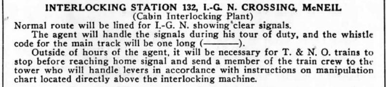 Left: These instructions from a June, 1940 T&NO Employee Timetable explain to train crews that they will need to operate the Tower 132 interlocker when the agent is not on duty. Elsewhere, the timetable lists the duty hours for the agent at Tower 132 as 8:00 am to 5:00 pm "Daily Except Sundays and Holidays" and "8:00 am to 10:00 am" on Legal Holidays. The tower was closed on Sundays. These instructions remained unchanged in a Special Instructions supplement issued by T&NO in December, 1959. Historic aerial imagery shows both the cabin and the depot removed between 1967 and 1973. |
