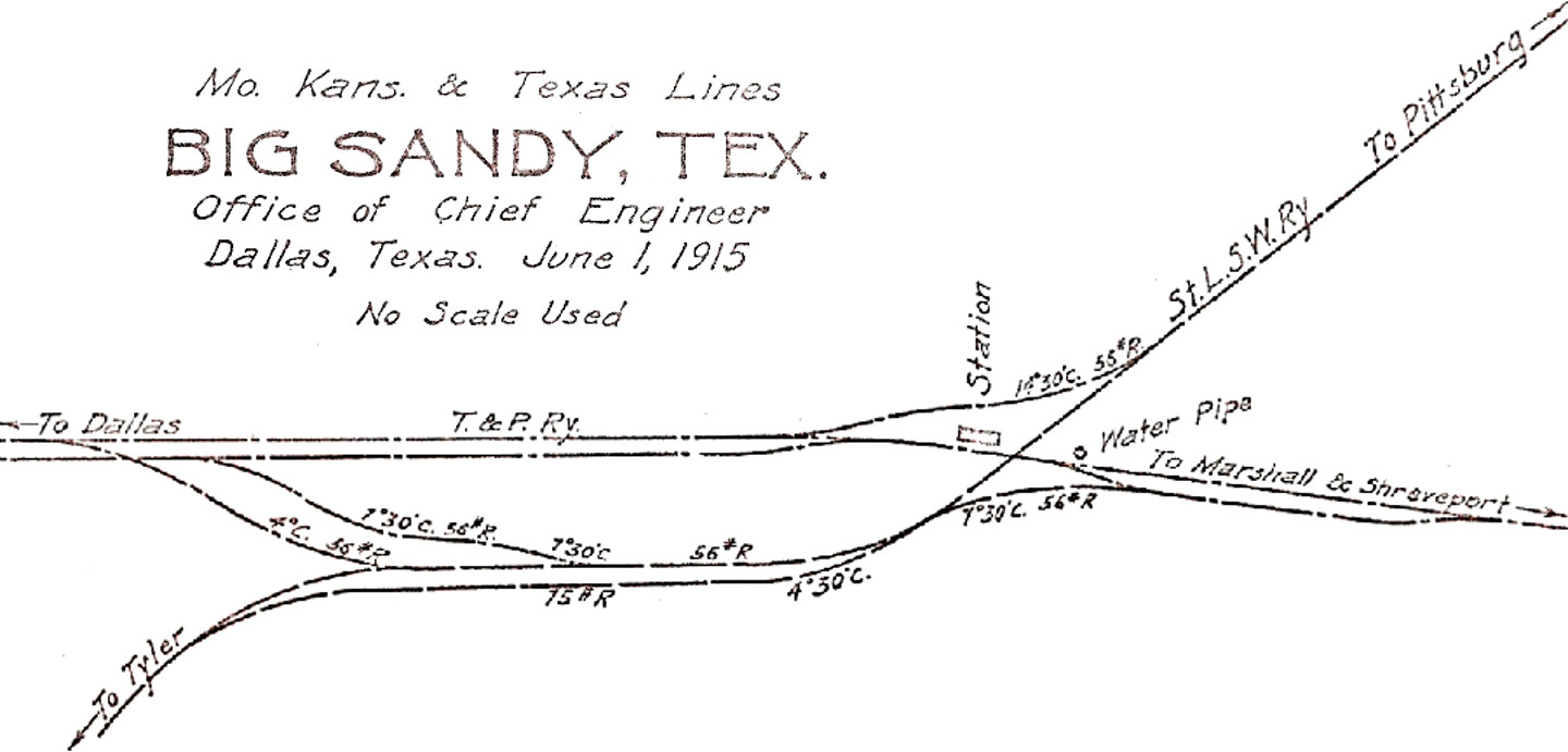 at far left is Big Sandy Lake, constructed by the T&P to provide water for steam