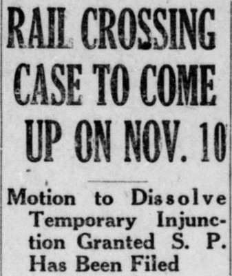 Brownsville Herald, October 26, 1927 In the same October 27, 1926 issue of the Brownsville Herald that produced the massive headline above, another article revealed that the location of the future Tower 138 crossing was the subject of a serious dispute between MP and SP. This dispute may also help to explain a curious aspect of SP's route into Harlingen. On October 16, 1927, a judge in Harlingen had granted a temporary restraining order requested by SP that prevented MP "...from running trains over certain tracks on property claimed..." by SP. SP believed it had acquired an option to purchase three acres near MP's yard which it intended to use as the location for the grade crossing over MP's tracks. MP claimed that prior to its awareness of SP's option, it had authorized $22,000 to procure the land directly from the owner, W. H. Neu, a resident of the tiny community of Lindsey six miles west of Gainesville near the Red River. Perhaps due to communications issues or mail delays, both railroads thought they had control of the land. MP wanted it to expand its yard while SP planned to use it to cross MP's tracks. SP asserted there was no other feasible crossing location while MP responded that a site a mile farther north would be suitable. The Google Earth image below has been annotated to show that less than two miles from Harlingen, SP's tracks turned due east to proceed across the MP tracks and then turn south. With rural, unpopulated land available for its right-of-way, there is no obvious reason for SP to have planned this jog to the east and then south. Projecting a route (yellow dashes) onto SP's approach angle surmises a crossing about where the disputed property was located. Apparently, a settlement ensued or perhaps SP simply lost its case. |