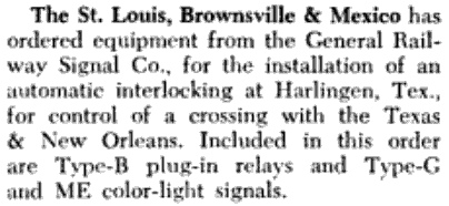 function formula promulgated by RCT. Left: The July, 1951 issue of Railway Signaling and Communications carried this news item regarding the installation of an automatic interlocking plant at Harlingen. Presumably the installation was accomplished later that year or in early 1952, resulting in the closure of Tower 138. The fate of the tower building is unknown. |