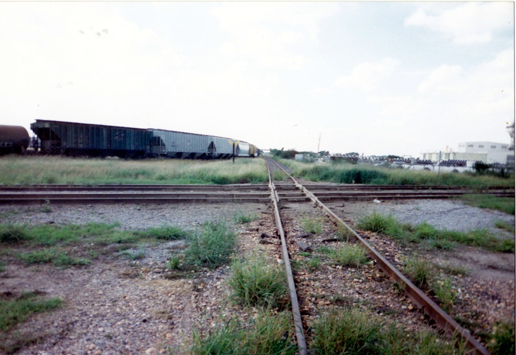 describes this photo he took in June, 1998: "This photo is looking south toward the MP Harlingen yard. The main is the left track and the yard lead is the right track. The SP line crosses from left (Harlingen) to right (Edinburg). The backs of stop signs are visible for northbound trains. Tank cars are sitting on the MP - SP interchange tracks. The connector track that allows southbound trains to access the SP line for Brownsville is out of picture to the left." |