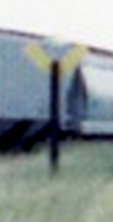 Compare this June, 1998 photo with the photo on the left at the top of page. Randy continues... "This photo is looking west on the SP toward Edinburg. The nearest MP track is the main; the other is the yard lead. Harlingen is to the south (left) and Kingsville is to the north (right). It is strange that an SP yard limit sign is so close to the diamond. Hopper cars are on the MP - SP interchange tracks." Below: yard limit sign ![]() |