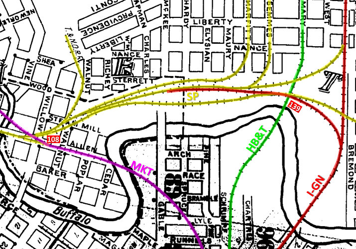 that only a single track (the original GH&SA line, now owned by T&NO) was crossing the HB&T at this junction.