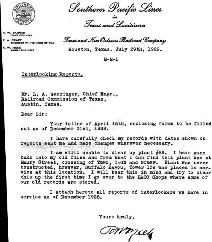T&NO Signal Engineer R. W. Meek's letter references "Buffalo Bayou, Tower 139"