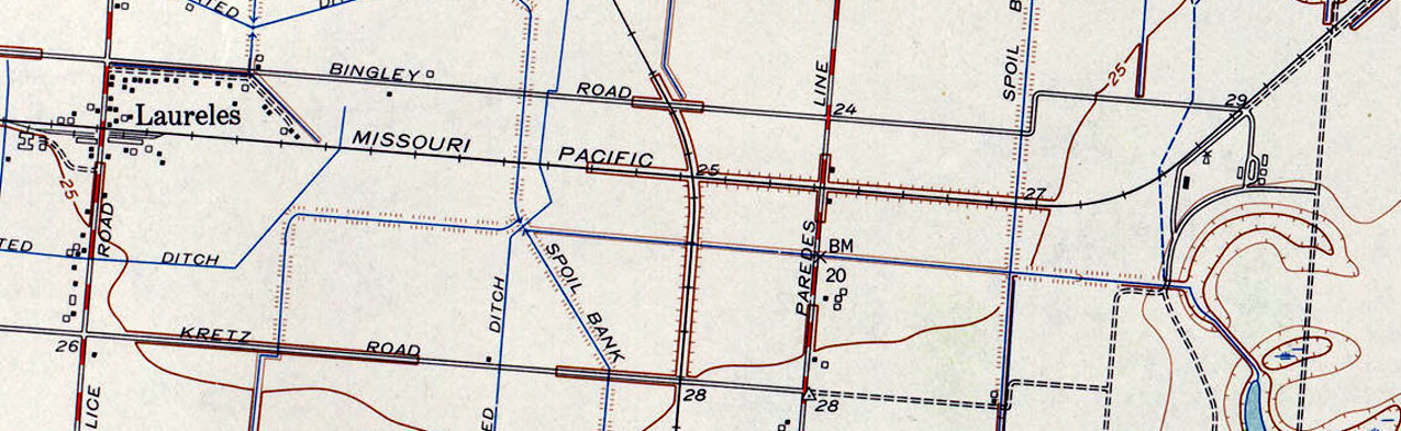 (Towers 145 and 149.) In response to SP restarting construction to the Valley, MP preemptively built an SLB&M branch line west from Raymondville in 1926. One objective was to reach areas in and around Edinburg before the SA&AP arrived. The branch went through Hargill and Faysville to Monte Christo, and there were additional branches from Hargill to Edcouch and from Faysville to Edinburg. SA&AP rails reached Edinburg in early 1927 and the SA&AP immediately built a 63-mile branch line east to Brownsville. The Brownsville branch crossed the SLB&M main line at Harlingen and also crossed the SB&RGV's Rio Hondo branch near Lantana. With the SA&AP entering Brownsville, MP countered with a 19-mile SB&RGV branch east from San Benito to Abney in 1928 (extended to Port Isabel in 1941.) This branch crossed the SA&AP east of Laureles and north of Los Fresnos, a location RCT recorded as "Rosita." The first interlocked crossing in the Valley was at Tower 138 (green circle), a 2-story manned tower where the SA&AP built across the SLB&M at Harlingen. It was commissioned on September 10, 1928. The last to be commissioned was Tower 151 (blue circle) on April 17, 1929 where the SB&RGV built across SA&AP's Brownsville branch. It was officially located at Rosita, a name used in SP's interlocker documentation. The map has locations called Laureles and Gray Bill nearby, but it does not show Rosita in the vicinity (nor anywhere else.) A 1932 MP timetable says that "Graybill" was 0.4 miles east of the crossing and Laureles was 0.8 miles west. SP timetables from the 1940s confirm the crossing near Laureles to be the site of Tower 151. |