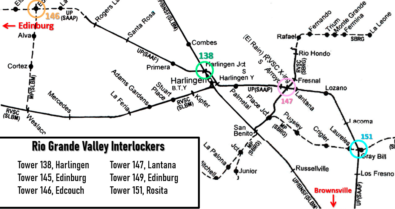 Through the end of 1930, RCT published an annual list of active interlockers. For each interlocker, the list included the railroads involved, the type of interlocking plant, the function count and the location. For all Lower Rio Grande Valley interlockers, the SA&AP and the SLB&M were listed as the railroads involved, even though Tower 147 and Tower 151 were on SB&RGV rail lines. The SLB&M was substantially larger and may have provided the rolling stock for operations on the SB&RGV. In 1956, as MP was being reorganized out of a lengthy bankruptcy, its various NOT&M railroads became fully merged and ceased to exist as separate entities as of March 1 of that year.