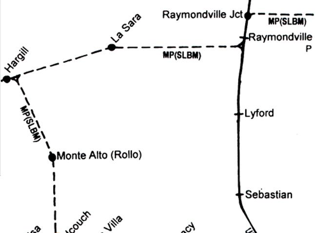 branch between Harlingen and Brownsville. Despite the map's solid line, the San Benito - Rio Hondo branch