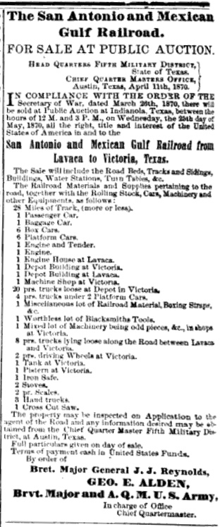 Despite the difference in spelling, the town of Placedo was named for Placido Benavides, a Mexican citizen and area rancher who had a prominent role in resisting Mexican forces during the early stages of the Texas Revolution. The community predated the arrival of the railroad just as the Civil War began. The charter for the San Antonio and Mexican Gulf (SA&MG) Railroad had been issued ten years before the War when citizens of Port Lavaca decided to grapple with the difficulty of moving freight between their port and the population centers further inland. With an immediate objective of reaching Victoria, the first five miles out of Port Lavaca was completed in either 1857 or 1858. The remaining 23 miles to Victoria was opened in 1861. The SA&MG did not survive the War intact, but it was rebuilt by the Federal government afterward. When the construction debt owed to the government could not be repaid, the line went into bankruptcy and was sold at auction to Charles Morgan in 1870.
