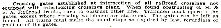 Left: A 1919 Employee Timetable (ETT) issued for the GH&SA by the U. S. Railroad Administration (which exercised Federal control of the railroads during World War I) incorporates this passage to explain the presence of gates at non-interlocked crossings (which in 1919 included Placedo) and how the gates should be operated. |