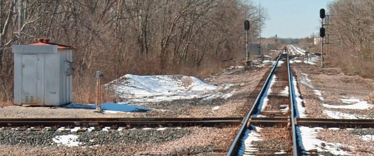 the angle of approach to the former SP main line at right. Tower 114 would have sat in the area of disturbed earth at the left edge