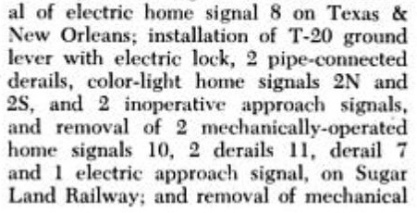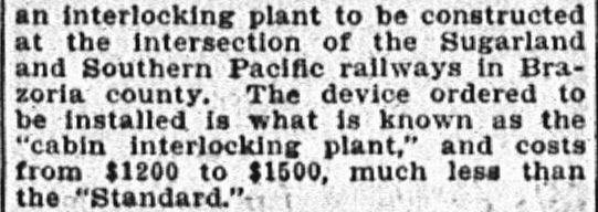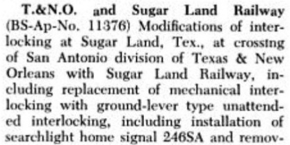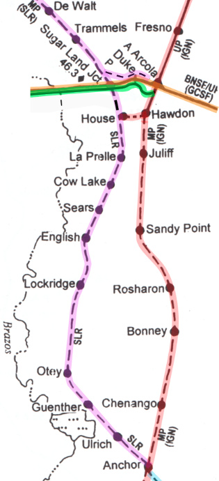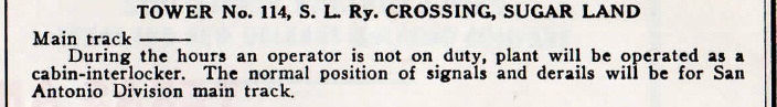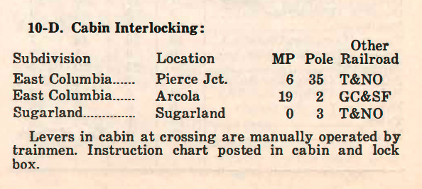 Left: A Special Instructions bulletin issued on September 15, 1952 by MP for its I-GN Palestine Division carried this paragraph noting a total of three cabin interlockers in the Division, all of them in the vicinity of Sugar Land. Cabins at Arcola (Tower 161) and Sugar Land (Tower 114, which was converted around this time to a ground-lever plant) are both listed, and Pierce Jct was nearby where the Columbia Tap crossed SP's line east of Tower 114. Sugar Land Junction (Tower 162) is not listed though it is reported elsewhere in the bulletin as interlocked (but not automatic.) It was probably an electronic plant with controls mounted on a post. The bulletin also has Sugar Land Jct. in a table of Yard Limits with a total span of two miles (!) but the reason is undetermined (particularly for such a lengthy distance.) Aerial imagery from the 1950s does not show a yard, only a single exchange track. The interlocker would normally be set to grant unrestricted movements to Santa Fe, and would have been operated by SLRy train crews when they needed to cross, i.e. it was a cabin interlocker without the cabin! A 1951 timetable shows only a single local freight daily (except Sunday) round trip from Sugar Land to Hawdon. |