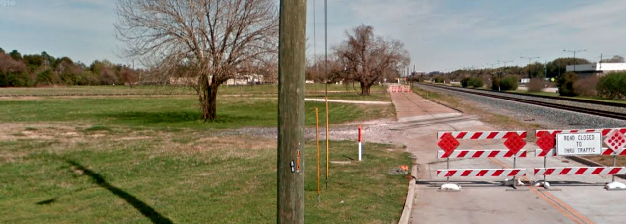is closed but the tracks remain visible in the pavement. At left, two Sugar Land
