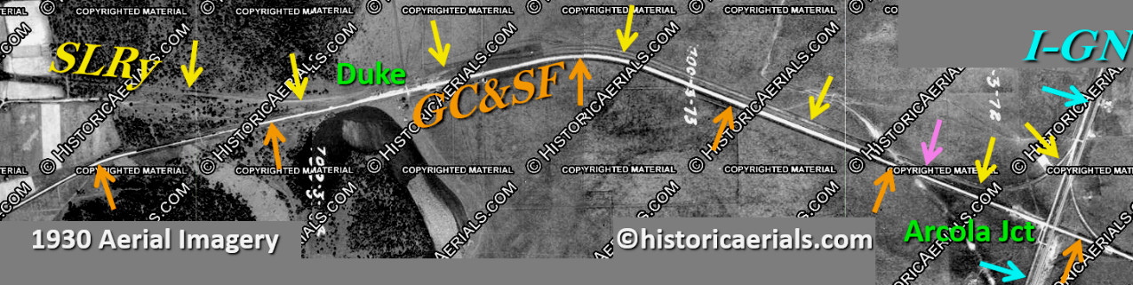This annotated Google Maps image shows the HL&P tracks in the vicinity of Arcola Jct.
