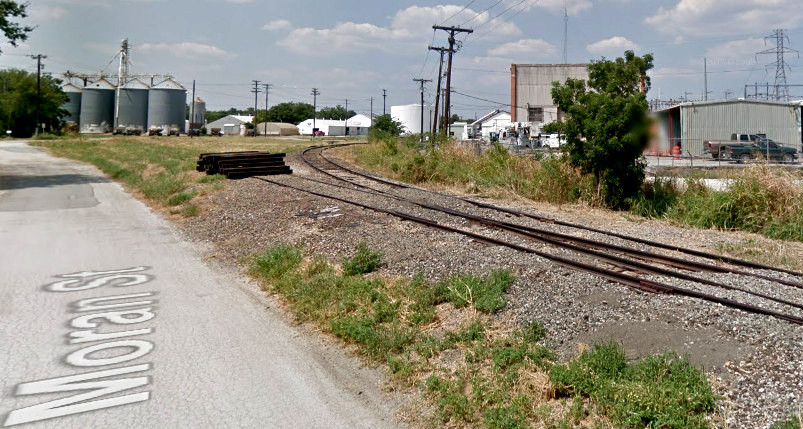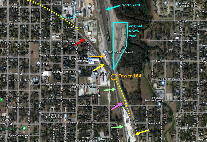 main (green arrows) was retained, and the Katy main (yellow dashes) was scrapped. The surviving Katy main northwest of the crossing, along Moran St., has a switch (red arrow)