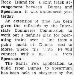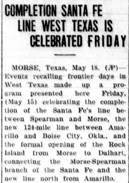 disrupted. Left and Right: The Rockdale Reporter of August 1, 1929 noted that the recent completion of Rock Island's line between Amarillo and Liberal resulted in the founding of several new towns in the Texas Panhandle, including Morse. Morse was significant because it soon became the target crossing point for an extension proposed by Santa Fe to connect Amarillo with their existing branch line at Spearman, 18 miles northeast of Morse. |