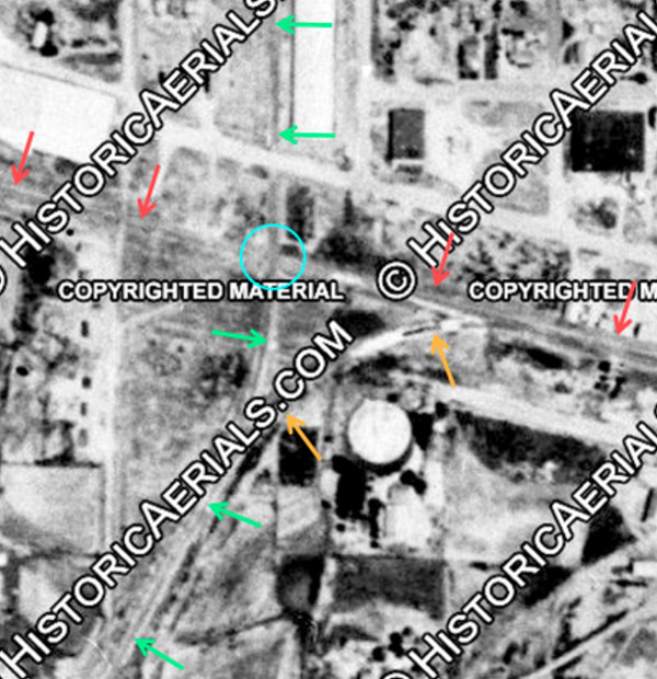 | Right: This 1941 image ((c) historicaerials.com) suggests there was a lot of commerce underway in Shamrock during World War II. A circular storage tank (oil?) sat near the track (orange arrows) that provided for interchange between the Rock Island (red arrows) and the FW&DN (green arrows.) The Tower 179 crossing (blue circle) was automated but lack of resolution and clarity in the image makes it difficult to discern the presence of an interlocker cabin. | ![]() |