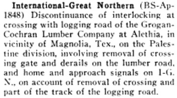 | Right: The August, 1940 issue of Railway Signaling and Communications carried this news item regarding the removal of the Alethia interlocking. In particular, note the "removal of crossing gate and derails on the lumber road, and home and approach signals on I-GN". A document at DeGolyer Library refers to a "crossing gate and derail" for Tower 178, but provides no further information. In 1930, RCT had discontinued the requirement to employ derails with new interlockers, at least in the context of automatic interlocking plants at Plainview and Lubbock. Derails had proven to cause more problems than they prevented. If so, why have derails on the tram line? Although the news item used "derails" plural, it might have been a single derail, consistent with the notation in the DeGolyer document. If so, it was likely placed on the mill (west) side of the diamond where it could protect against loose lumber cars rolling uncontrolled out of the mill yard and across the I-GN main line. This was (and still is) a common feature for industry spurs. Such derail might have been appropriate for the mill tracks at Alethia, depending on the track topology and their proximity to the I-GN. A tram derail east of the diamond might have been omitted since all inbound trams stopped at the crossing anyway to change the interlocker controls to allow passage across the I-GN tracks. | |