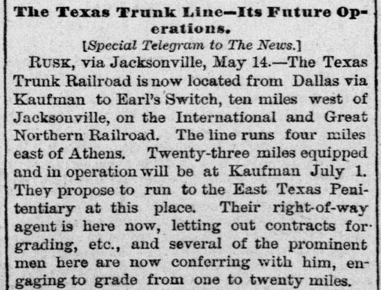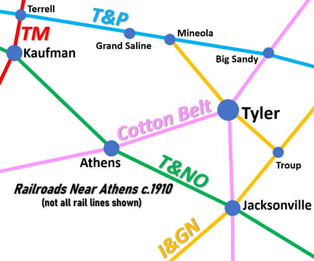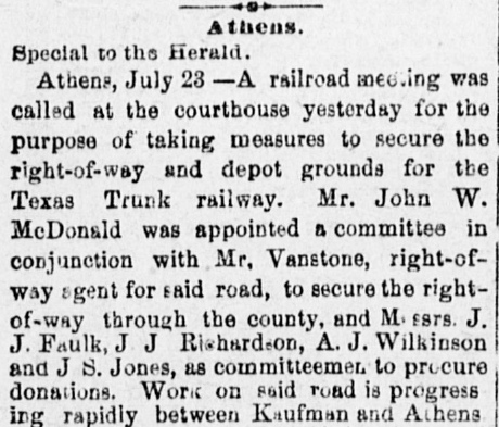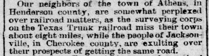 appeared to be heading for Athens in 1879 was the Texas Trunk Railroad. The