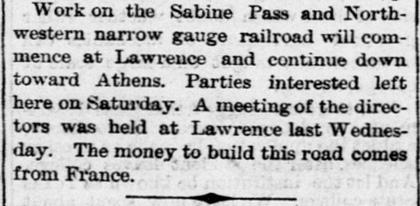 ...apparently ... was misinformed about this enterprise. In its issue for 1879, it reports that 11 miles from Lawrence, Texas to Kaufman was completed, already graded from Lawrence to Athens, 50 miles... that the whole road was under contract from Sabine Pass to Denison... However, in subsequent issues no mention is made of this road... The author has sought information from old timers in the sections where this road is supposed to have been graded and in operation. From these sources it is learned that a few miles of grade was thrown up out of Lawrence toward Kaufman but no rails were laid, and the project was abandoned about 1880.