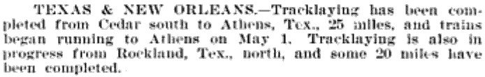 T&NO resumed construction from Cedar, reaching Athens (26 miles) in