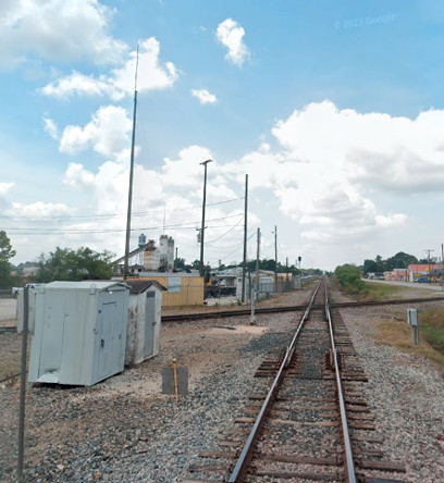 location, now flanked by its replacement (white roof.) Below: This Google Street View from June, 2022 looks southwest along the exchange track from near the BNSF (ex-Santa Fe) connection. An orange derail and a warning sign protect the main line from potential loose cars on the exchange track. The depot lead appears to have been removed as no switch is evident. ![]() |