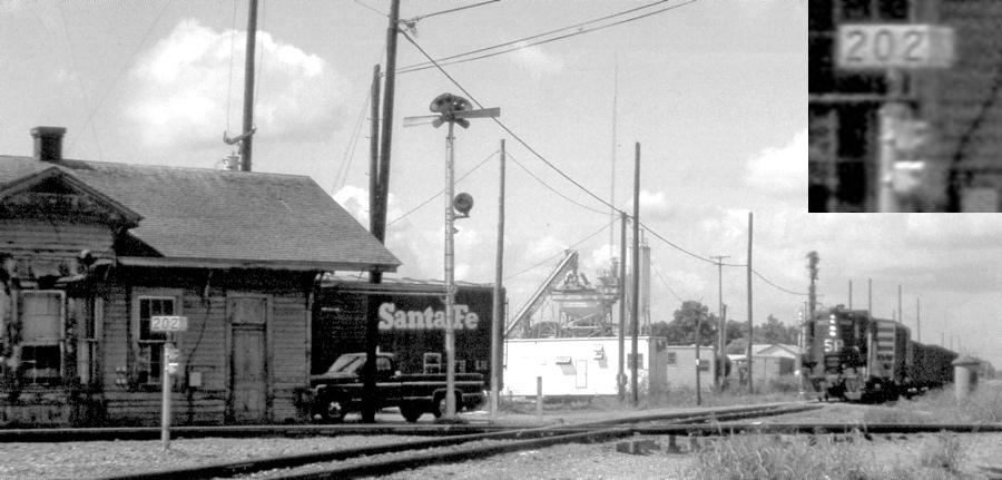 Southern Pacific (SP) subsidiary. The camera faces south across the diamond with SP's track nearest the camera to the left proceeding north-northeast to Lufkin. The Santa Fe track beside the depot heads northeast (left) but soon turns east to reach Silsbee. SP's locomotive is approaching the depot on a track that leads back to Houston, 43 miles southwest. The Santa Fe line at the right edge of the image continues southwest to Conroe. At some undetermined date, probably after 1939, SP began sharing Santa Fe's depot for passenger operations. This certainly made it easier for connecting passengers since SP's depot was a half-mile away. The Santa Fe boxcar is sitting on a stub track that was originally a depot lead for Santa Fe trains. It comes off of a connecting track (still intact) behind the depot that facilitated freight interchange between the railroads. (photo June, 1980, Joe R. Thompson, courtesy Railroad and Heritage Museum, Temple; from Southern Pacific's Eastern Lines 1946 - 1996 by David M. Bernstein) Left Bottom: This photo taken from the opposite quadrant of the diamond looks generally north-northeast along the SP tracks toward Lufkin as an SP caboose passes over the diamond. The depot was built by Santa Fe sometime before 1930 and served as a freight and passenger station. It later became the joint depot; the faded heralds of both railroads are visible in the photo. The white cabin near the Santa Fe tracks housed the automatic interlocking plant. The "202" control stand is barely visible in the shadow of the railcar between the cabin and the SP tracks. The sign was square with numbers on all sides so that train crews could recognize it from any direction. This may be the only interlocker number sign in Texas to have been mounted atop a control post. More typically they were mounted on the sides of nearby towers, depots, cabins, equipment cabinets or yard offices. (photo Moon Young, November 4, 1982, courtesy Cleveland Historical Society - Museum.) |