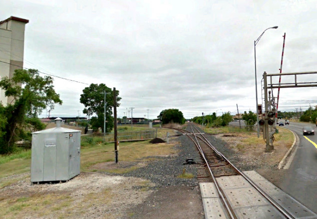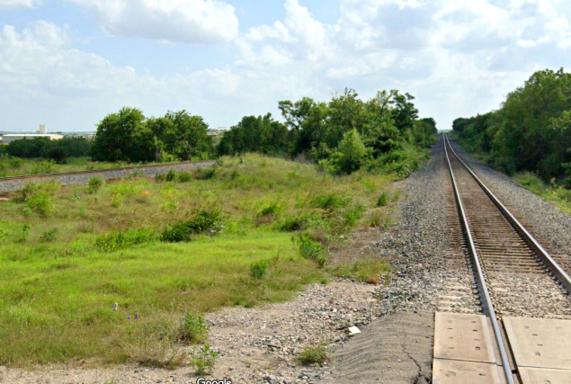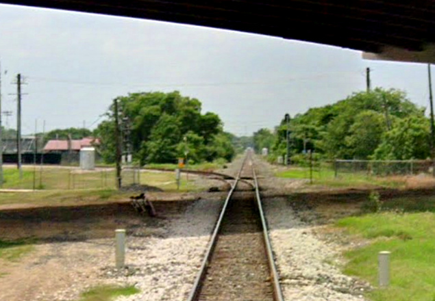 former Katy tracks to the left. The I&GN tracks are visibly rising to cross the