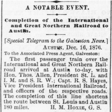 Austin's second railroad arrived in 1876 in the form of the International & Great Northern
