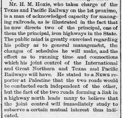 Longview was selected instead of Texarkana as the Texas & Pacific was planning to build from Texarkana to Longview. Hearne was selected because the H. & T. C. had reached that point. All the materials except ties, timber and piling, came by steamer to Galveston and by barge or G. H. & H. [Galveston, Houston & Henderson] to Houston, thence to Hearne over the H. & T. C. By December 13, 1871, 50 miles had been completed and by July 12, 1872, Palestine, 90 miles from Hearne, was reached. In the meantime equally rapid progress was made on the line from Longview to Palestine, which was completed January 31, 1873.