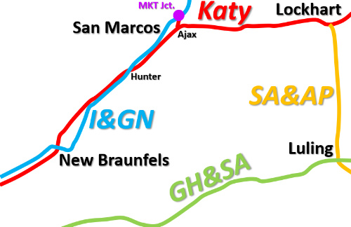 Since the two railroads touched at both New Braunfels and San Marcos, the I&GN and Katy employee timetables