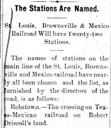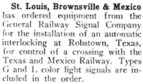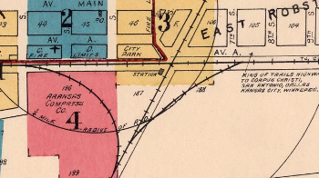 image) Below: This snippet from a 1922 Sanborn Fire Insurance map of Robstown shows connecting tracks in both of the south quadrants. The southeast connector facilitated service between Brownsville and Corpus Christi. The southwest connector most likely had been used for Brownsville - San Antonio traffic when the SLB&M first opened, avoiding the circuitous TM / SA&AP route through Corpus Christi and Gregory in favor of the TM / SA&AP route west via Alice. Both routes went through Skidmore but the west route would have been less congested. ![]() |