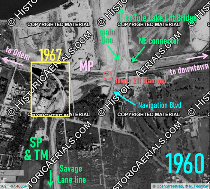 All of the new construction was built to SP standards with SP switch targets and SP mileposts markers. The right of way was owned by the Navigation District. Thus, the interlocker was built as a MP / T&NO crossing. A T&NO signal maintainer was responsible for the crossing interlocking and the lift bridge interlocking. A new interchange yard was built just north of the Tule Lake Lift bridge. This eliminated the need for street tracks downtown. The SP maintained the entire track from Savage Lane to the old SP main line on North Beach as their main track until the SP abandoned the trestle and re-routed trains via Sinton-Odem-MP Junction.