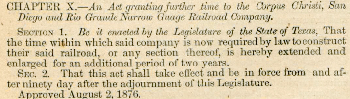 in 1881 (but it was not extended to Eagle Pass.)![]() from Special Laws of the State of Texas passed at the Session of the Fifteenth Legislature (Portal to Texas History) |