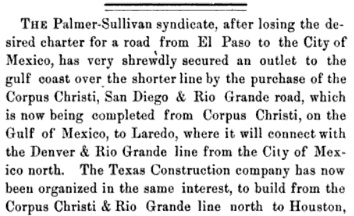 Left: Railway Age, December, 1881 With new owners, the TM had moved aggressively to announce great plans for expanding their narrow gauge network in south Texas. In response to these pronouncements, as early as May, 1881, the City of Galveston began trying to induce the TM to build there by offering various incentives. In an interview with Gen. Palmer in the Galveston Daily News of May 3, 1881, Palmer claimed already to be building a narrow gauge line between Houston and a TM junction at San Diego under the charter of the Houston East & West Texas (HE&WT) Railroad. The line would run "...from Houston to Richmond, thence to about six miles north of Wharton to Victoria, thence to Goliad, Beeville and San Diego." The HE&WT was a narrow gauge line that had commenced building from Houston toward Shreveport in 1877. According to Palmer, ... "In a very short space of time there will be a continuous line of narrow-gauge road from New York City to the City of Mexico." Connecting to the HE&WT on the north side of Houston would require a right-of-way through the city. The Galveston Daily News of September 21, 1881 reported that in response to a letter from TM's Chief Engineer, the Houston City Council passed an ordinance offering a detailed right-of-way through Houston along with specific terms and conditions regarding construction, maintenance and operation, requiring a first class narrow gauge railroad connecting to TM's existing Corpus Christi - Laredo line. But railroad talk was always big; none of the TM's ambitious plans ever proceeded beyond the planning stage. |
