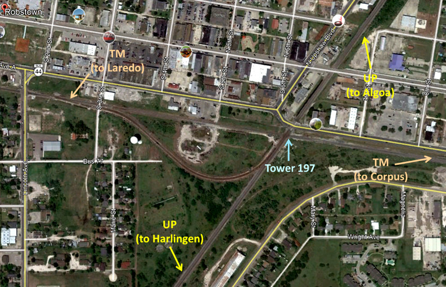 Left: This Google Street View image in Robstown looks south along UP's main track to Harlingen. In the foreground, the TM crosses the Tower 197 diamonds. Just beyond the equipment cabinets near the center of the image, the connector for traffic to Laredo is visible as it begins to curve to the right toward its connection with the TM about 0.4 miles west. |