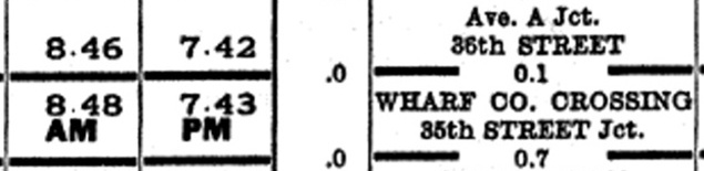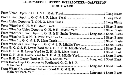 adopted by the other railroads since 36th Street was not nearby. Left, Second: This 1930 T&NO ETT presents the whistle codes that pertain to T&NO trains at Tower A under a title that begins "TOWER, 35th STREET..." T&NO associated Tower A with 35th St. and there was also a junction switch associated with 34th St. But neither of these streets was near the tower nor intersected Mechanic St., faring no better than 36th St. as a naming rationale. Yet, this must be Tower A as there were no other manned towers in the area (to hear the whistle codes!) and the codes for T&NO trains to reach their main track (three long blasts) or the Post Office track (two short blasts) is the same as for the "Thirty-Sixth Street Interlocker". Left, Third: This 1951 T&NO ETT lists the same whistle codes, but uses the confusing title "TOWER 36, 35th STREET...". This appears to be an attempt to combine the 36th St. reference used by Santa Fe with the 35th St. reference that T&NO had been using. Unfortunately, it conveys the erroneous message of referring to "Tower 36" located in Bryan. Left, Fourth: Elsewhere in the 1951 ETT, T&NO associates "35th St. Tower" with the mileposts for the 34th St. junction and the 35th St. crossings. Left, Bottom: In 1939, Santa Fe referenced the Tower A junction as "Ave. A Jct., 36th STREET" apparently confusing Ave. A with Tower A. Mechanic St. was platted as Avenue C, not Avenue A, which was two blocks from the tower, more than 200 yards away at the closest point. Another junction 0.1 miles closer to Union Station was referenced as "WHARF CO. CROSSING, 35th STREET Jct." Elsewhere in the 1939 ETT, Santa Fe confirms that these two crossings are "protected by interlocking plant", but it does not name the tower. By the end of the 1990s, all of these railroads had been consolidated into two large systems: Union Pacific (GH&H and T&NO) and Burlington Northern Santa Fe (GC&SF and B-RI.) |