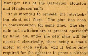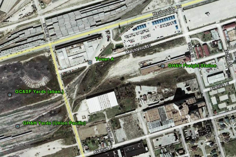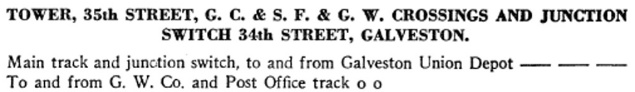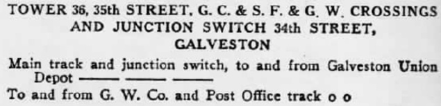 Mechanic streets...". Santa Fe built Tower A c.1897 near the hypothetical intersection of 36th and Mechanic streets, hypothetical because 36th Street is not known to have ever extended all the way to Mechanic St. The intersection appears to have existed only on the official plat of Galveston. Tower A had the first interlocking plant in Texas; this was presumably the rationale for the 'A' name given by Santa Fe. |